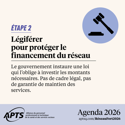 Année après année, malgré la croissance des besoins, le financement du réseau public demeure insuffisant, instable et imprévisible. Cette logique fragilise la planification, accentue la pression sur le personnel et compromet la qualité et la continuité des services offerts à la population. En 2026, l'APTS propose de changer de cap et de faire de la santé et des services sociaux des priorités non négociables.