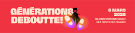 Aujourd’hui encore, les forces économiques, politiques et sociales divisent, oppressent, et cherchent à restreindre nos droits, à freiner nos avancées, à semer la peur et la haine. D’une génération à l’autre, nos appels se répondent, nos luttes s’entrelacent et nos victoires se tissent ensemble vers l’égalité. Le féminisme se renouvelle, s’enracine et se nourrit de la diversité. Pour contrer ces courants réactionnaires, allons puiser dans nos forces féministes vivantes, solidaires et multiples. Reprenons cet élan, ne tolérons aucun recul : Générations deboutte!