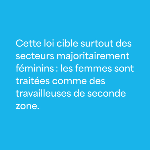 Ce projet de loi nuit aux femmes puisqu’il vise des milieux de travail majoritairement féminins, et ce, bien qu’un niveau de risque élevé y soit désormais reconnu. S’il est adopté dans sa forme actuelle, les travailleuses seront privées de protections dont bénéficiera encore le personnel des milieux à prédominance masculine.