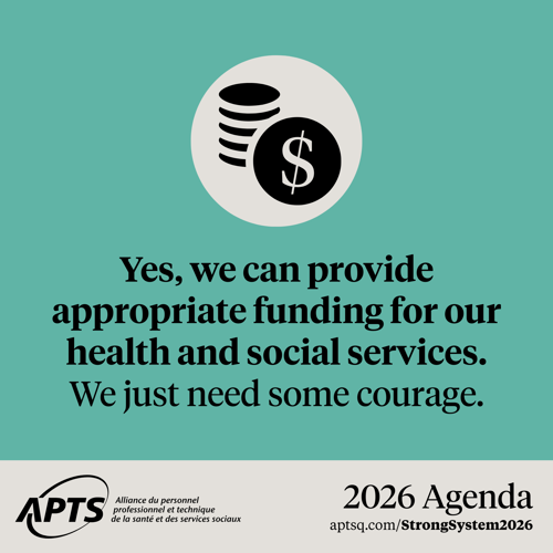Year after year, despite growing needs, funding for the public system is insufficient, unstable and unpredictable. This approach undermines planning, puts additional pressure on employees and compromises the quality and continuity of services to Quebecers. In 2026, the APTS is proposing a change of course to make health and social services non-negotiable priorities.