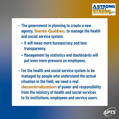 Did you know that Minister Dubé’s Bill 15 to “make the health and social service system more efficient” will encourage greater use of the private sector at the expense of our public system? That the minister is getting ready to create Santé Québec, a new administrative structure that will centralize decision-making even though the agency will be miles away from what’s happening on the ground? That he plans to eliminate local collective agreements, denying your region’s specific characteristics? That he wants to merge all local bargaining units, removing your right to choose the union that will represent you?