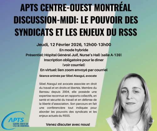 Les personnes membres APTS sont invitées à participer à une rencontre-midi portant sur les pouvoirs des syndicats et les enjeux actuels du réseau de la santé et des services sociaux (RSSS).