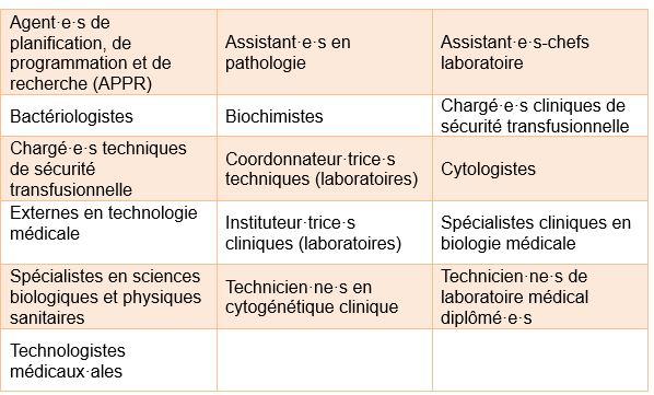 • Le partage des actes entre les différents titres d’emploi dans les laboratoires cause des problèmes pour la reconnaissance de l’expertise des personnes technologistes médicales et techniciennes de laboratoire diplômées, qui doit être plus valorisée.