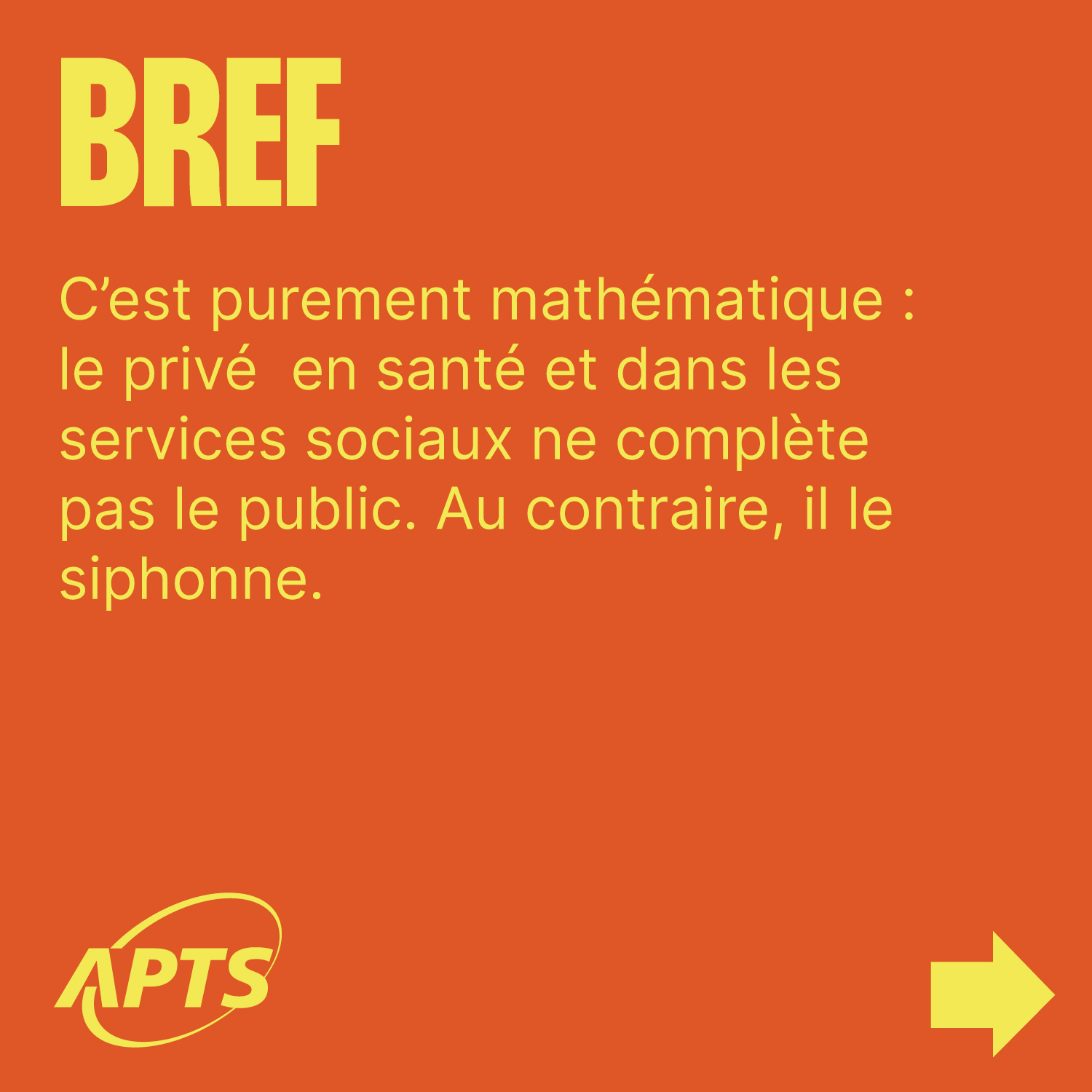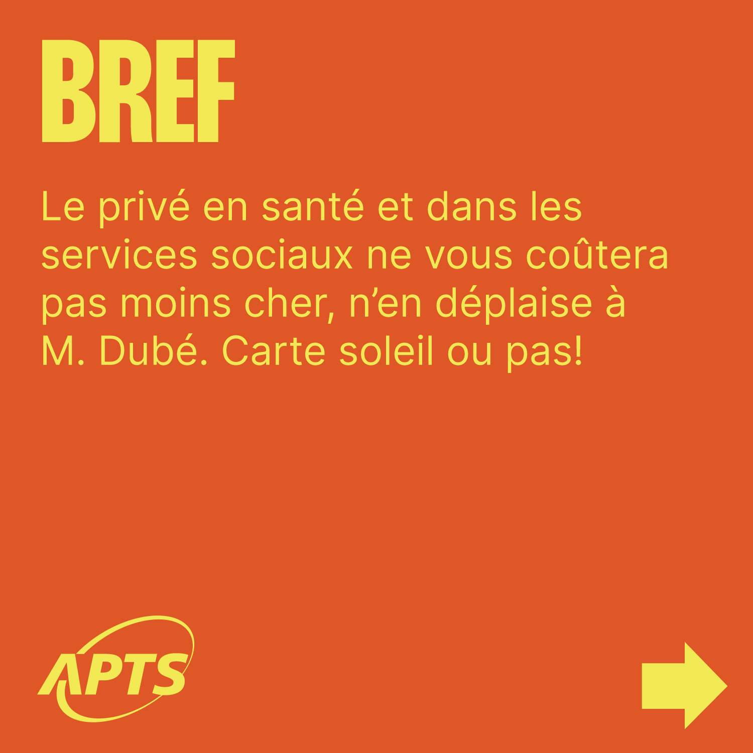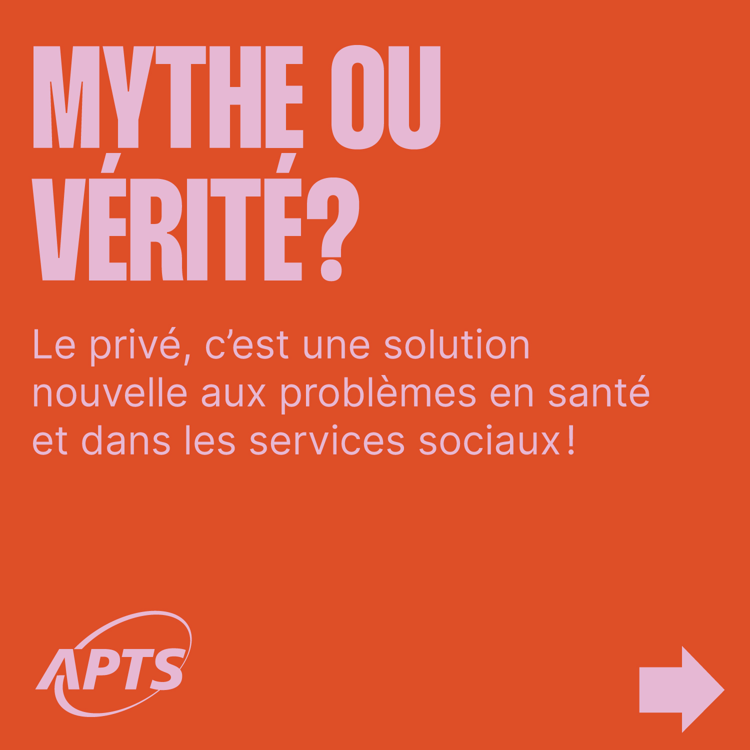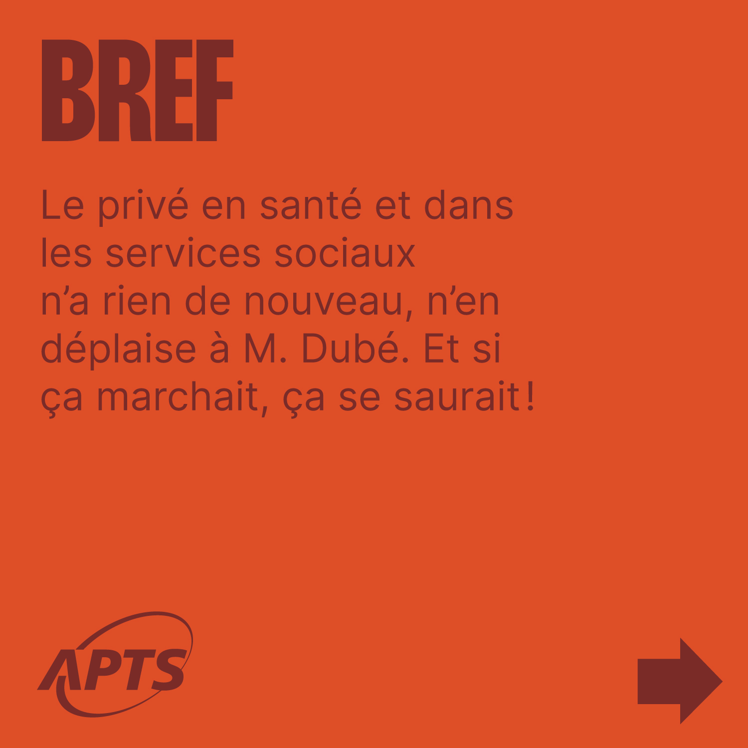 L'APTS revendique des mesures publiques audacieuses auprès des élu·e·s du Québec et des dirigeant·e·s des établissements de santé et services sociaux afin d’assurer à la population une offre de services publics, accessibles, inclusifs et égalitaires. Le ministre Dubé, de son côté, recycle une vieille recette en ouvrant la porte toute grande au privé, invoquant des arguments pour le moins douteux.