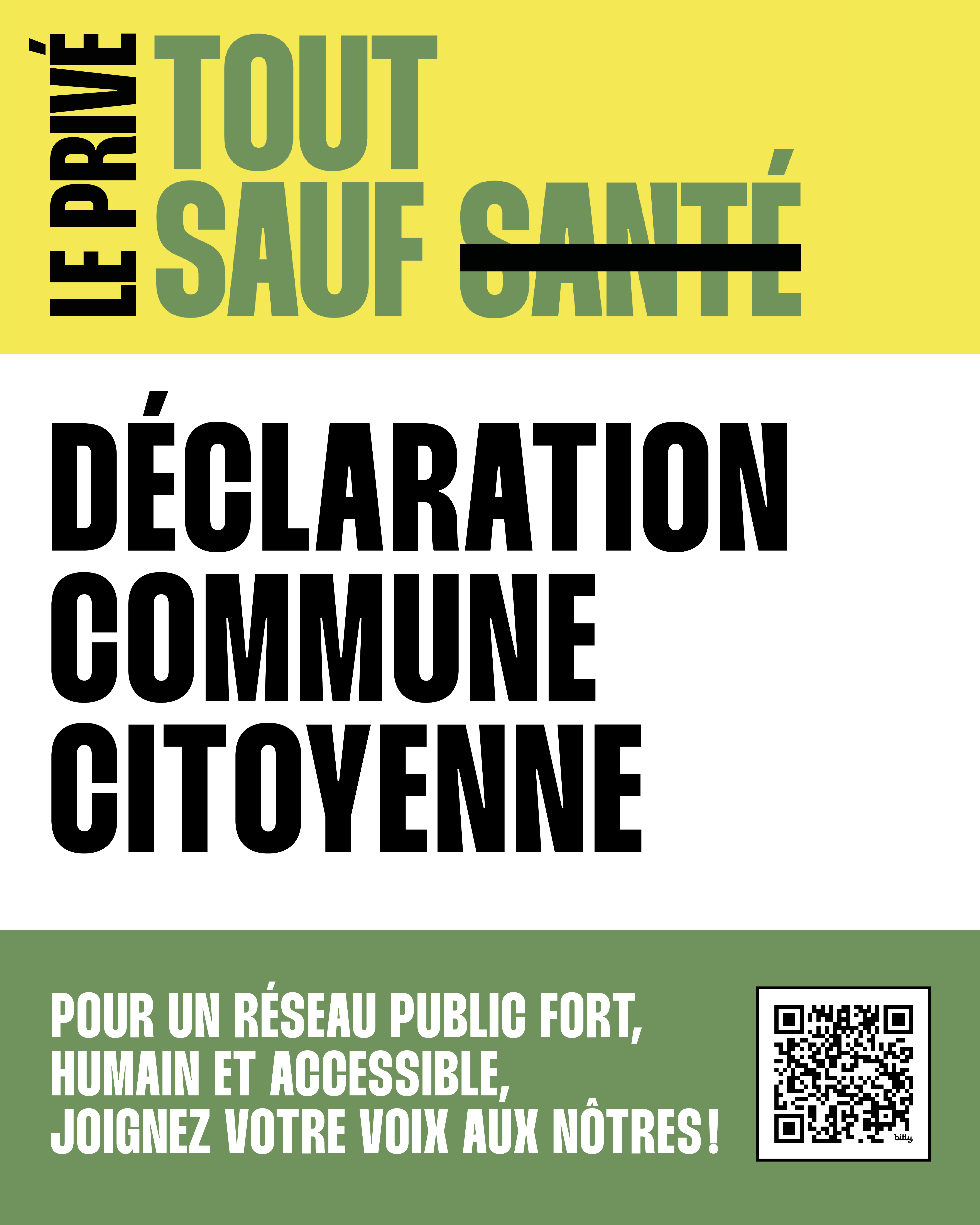 Privatiser les soins et services, c’est affaiblir notre réseau public. Avec la réforme Dubé et la création de Santé Québec, le gouvernement impose un modèle hyper-centralisé et déroule le tapis rouge aux intérêts privés, au détriment de l’accessibilité et de la qualité. Résultat: délais d’attente prolongés, conditions de travail dégradées, sous-financement chronique et services de proximité en péril. Une large coalition s’organise pour envoyer un message fort : la santé n’est pas une marchandise, c’est un droit fondamental! Pour un réseau public fort, humain et accessible, signez la déclaration commune.